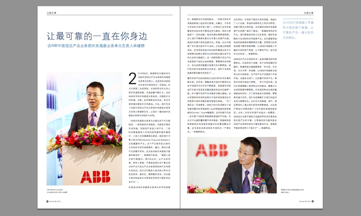 ABB集团位列全球500强企业,集团总部位于瑞士苏黎世。ABB由两个历史100多年的国际性企业瑞典的阿西亚公司(ASEA)和瑞士的布朗勃法瑞公司(BBC Brown Boveri)在1988年合并而成。两公司分别成立于1883年和1891年。ABB是电力和自动化技术领域的领导厂商。ABB的技术可以帮助电力、公共事业和工业客户提高业绩,同时降低对环境的不良影响。ABB集团业务遍布全球100多个国家,拥有13万名员工。传大优浦公司作为ABB中国公司的供应商,为其提供了众多的内刊设计(季刊)。